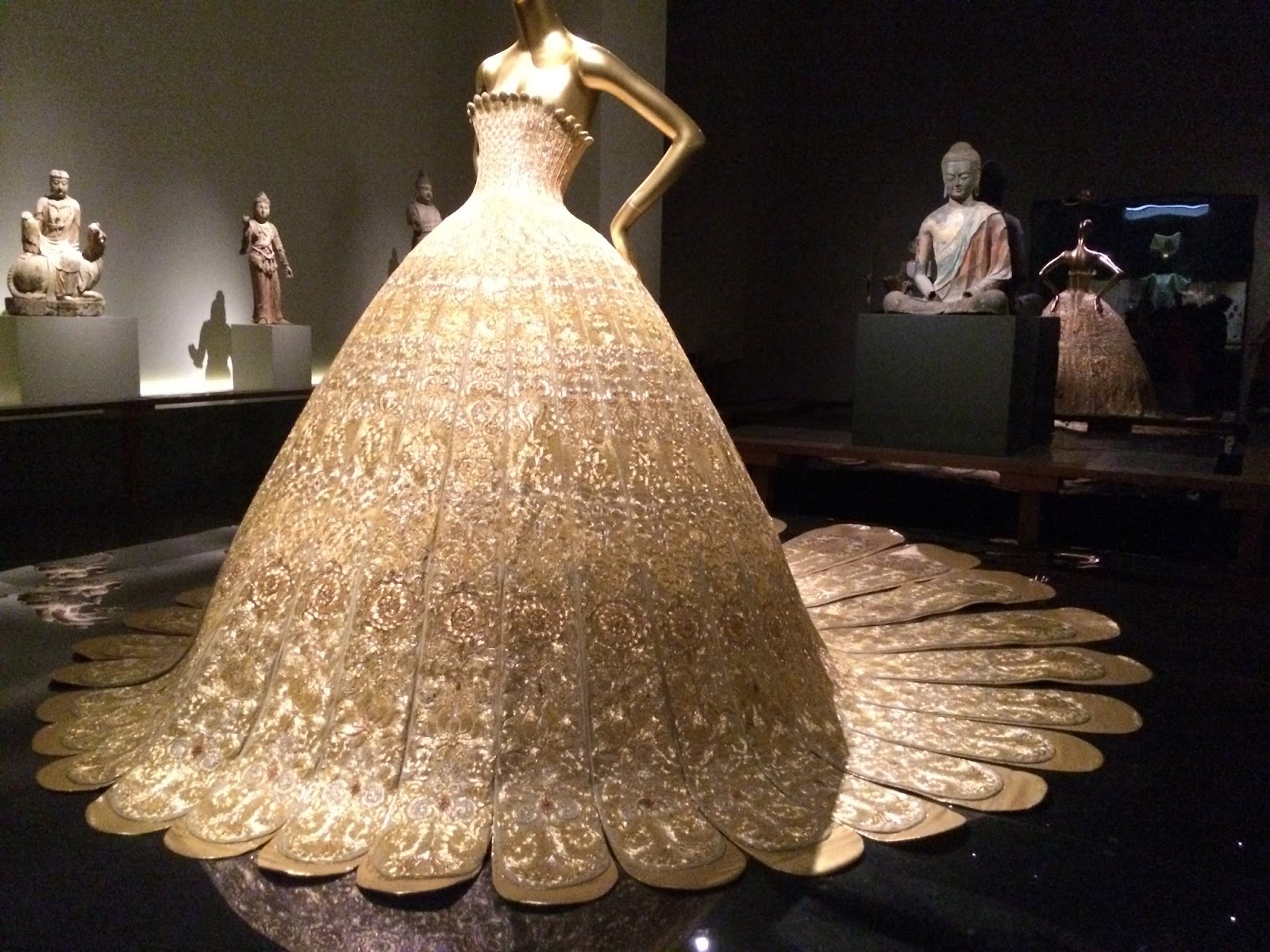 While I really enjoyed many of the rooms, the one that just blew me away was in a room of buddhist sculpture with a dress, called Magnificent Gold, from Chinese designer Guo Pei, the same designer who made Rihanna's embroidered dress (Her Chinese plate dress was my favorite as well). It was so visually stunning that it wasn't even until I reviewed the photos later at home that I realized it was inspired by Chinese fans! The entire thing was embroidered in gold thread. It was the only dress in the room because it would have overwhelmed anything near it. Stunning and one of the dresses I wanted to see move down the catwalk. The Beijing designer is creating huge waves with her embroidered extravaganzas based on cultural references from her home country. Watch a brief recap of her 2013 show (which includes few pieces from the MET exhibit). The Huffington Post had a nice article with dozens of her richly embroidered designs at the bottom. For those of us who want thread and skills to remain alive, designers like this are a huge part of the solution, making it cool and providing enormous amounts of work for the craftsmen and manufacturers.