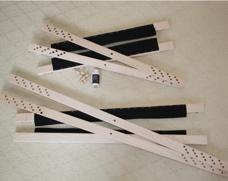 I have two types of slate frames in stock now! One is the right size to work a full side of a casket and the other is a very large one that allows large projects such as the mirrors to be worked. The small one is a 16" roller (width of webbing) with 22" slats whereas the larger one is a 22" roller (width of webbing) with 34" slats.