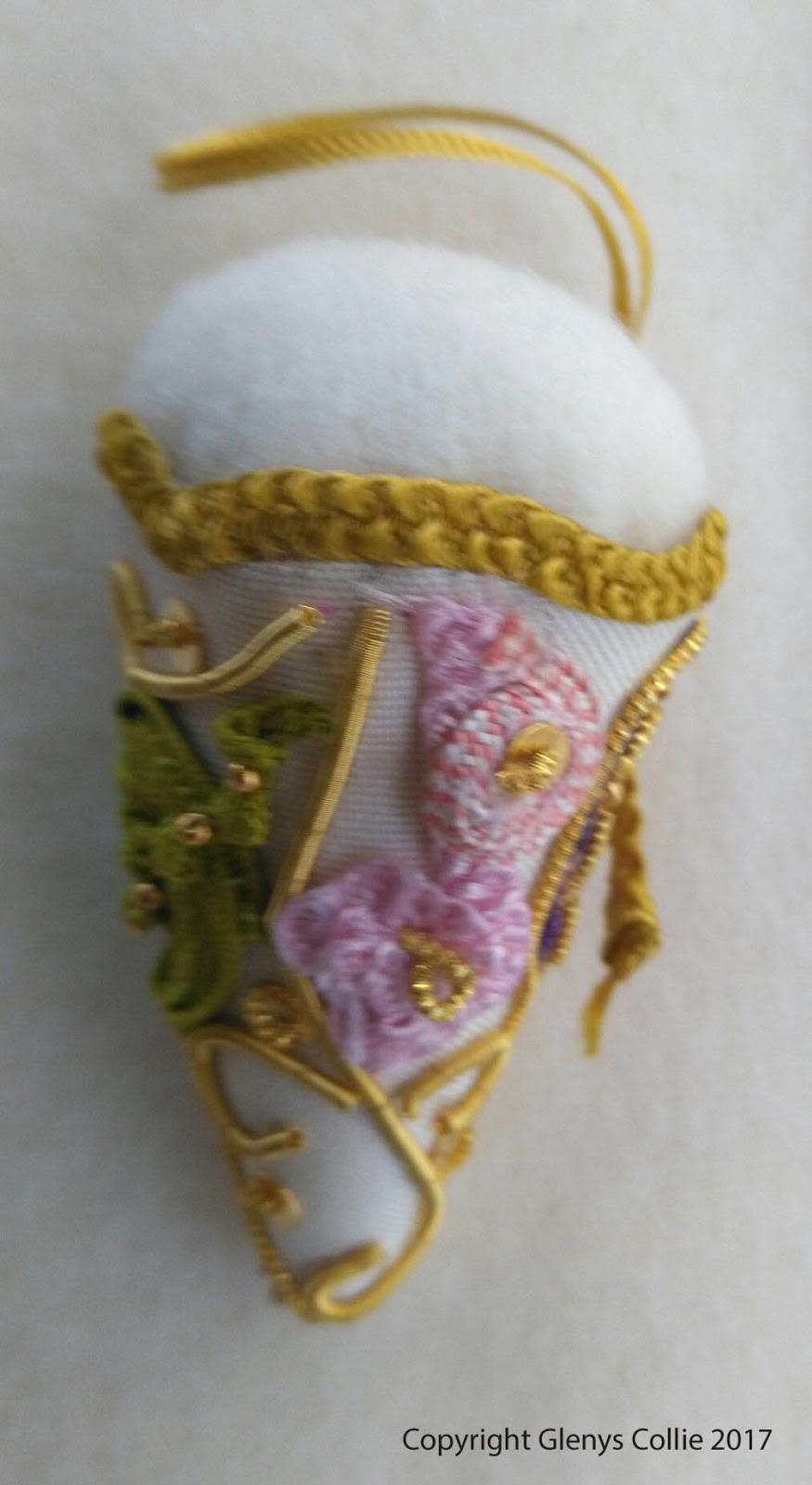 The same design and method as for the tape measure only stuffing the cone with wool wadding (so pins don’t rust) and a wool fabric circle added on the top. . It features two pieces of silk fabric. One piece forms the lining and the outer piece is encrusted with 24ct antique gold beads, pearl purl and smooth purl. Purple Lacet is added on one side in laid work with gold beads in the centre and intersections of pearl purl and grid edged with check purl. This is matched on the other side with a bright pink Lacet grid, gold beads and intersections of pearl purl and edged again with the check purl.The design also features scrolls of smooth purl, Pink Lacets flowers with gold beads and spangles. These are balanced by a lovely green Lacet leaf containing a knotted centre vein and gold beads. The finishing touches is added with a gathered gold Lacet trim and looped gold Lacet for hanging.
